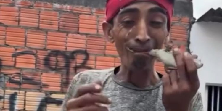 Além disso, ainda põe o filhote na boca, no bolso e faz ele morder seu dedo. Uma pessoa filma a cena e pede que ele devolva o jacaré ao igarapé.