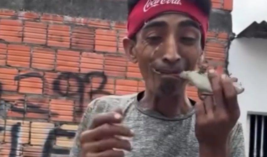 Além disso, ainda põe o filhote na boca, no bolso e faz ele morder seu dedo. Uma pessoa filma a cena e pede que ele devolva o jacaré ao igarapé.