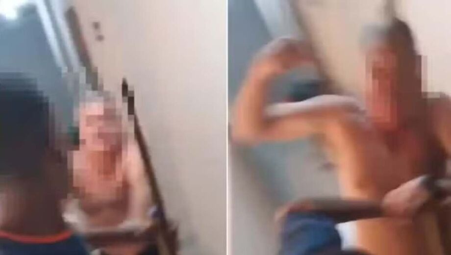 “Vocês não podem me tratar assim”, diz o faxineiro. Neste momento, o homem tenta puxar o celular da mão da vítima, mas não consegue.