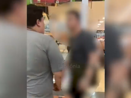As funcionárias do estabelecimento ficaram do lado da mulher e acabaram sendo xingadas por ele. Foi quando um homem apareceu e começou a brigar com ele, chegando a acertá-lo, enquanto ele ofende, faz gestos com as mãos e pega nas partes íntimas.