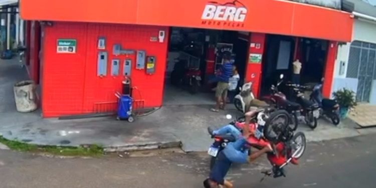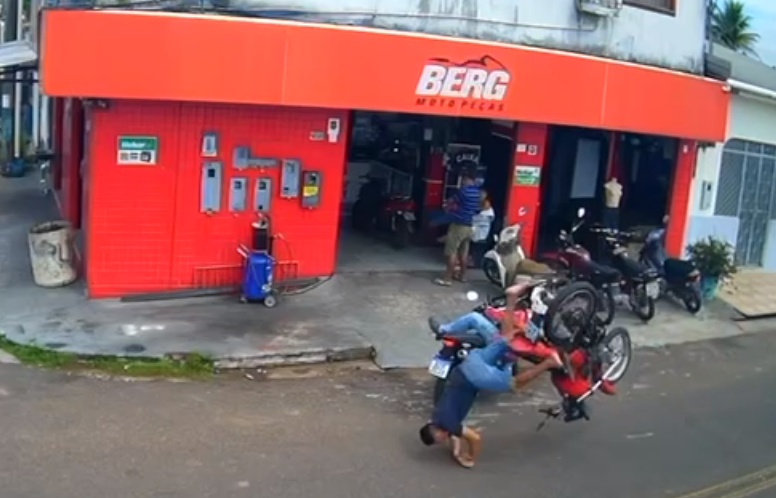 Uma câmera de segurança registrou o ocorrido na frente de uma loja de autopeças. Um mototaxista aparece tentando dar o retorno quando é atingido pelo outro homem, que vem sem capacete.