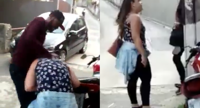 No início, o ex-casal aparece conversando normalmente, mas logo o homem se estressa. Ela teria ido cobrar a pensão alimentícia dos filhos. Eles discutem e nesse momento um carro até passa do lado e, mesmo assim, o homem não se intimida e retira uma faca da mochila.