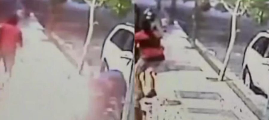 O rapaz caminhava pela calçada quando dois criminosos chegaram em uma motocicleta, prestes a anunciarem o assalto. Mas a vítima, como um gato, saltou pelo muro da casa, chutou os bandidos, que caíram da moto direto no chão enquanto o jovem fugiu correndo.