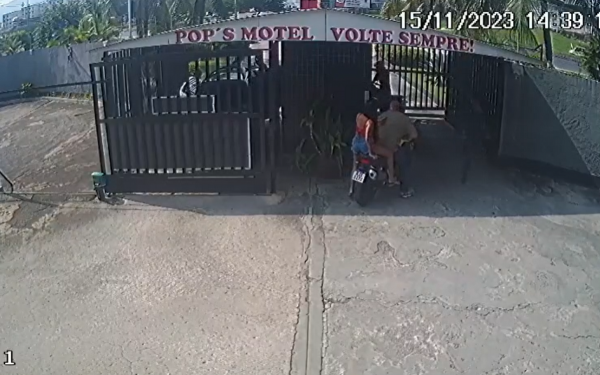 Câmeras de segurança flagraram o momento em que o homem, na motocicleta, saía da portaria do estabelecimento. Três homens em um Fiat Palio Adventure acertaram os tiros e fugiram ao perceberem que uma viatura estava próxima.