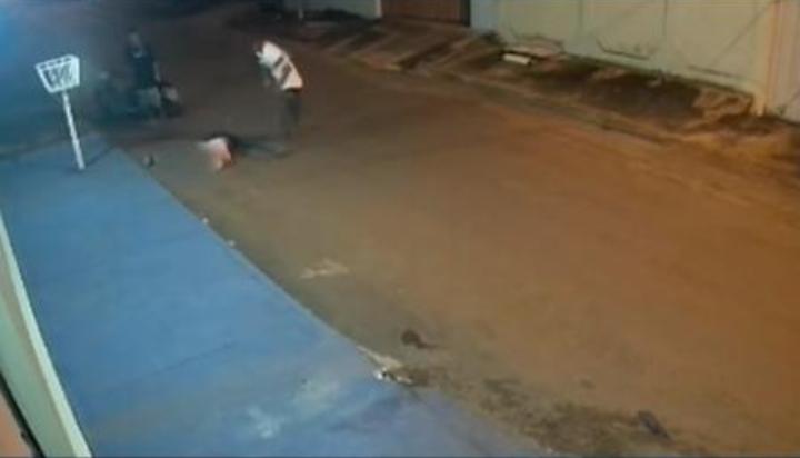 Nas imagens, é possível ver os criminosos em uma motocicleta, abordando e agredindo a vítima com várias pauladas, que ficou desacordada no meio da rua.