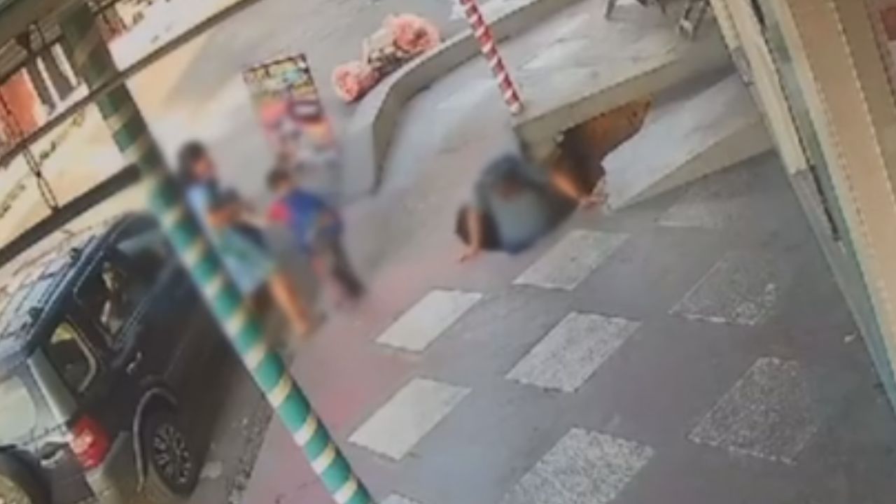 O rapaz aparece caminhando tranquilamente na esquina entre as ruas Itibiara e Itaete, quando, ao pisar na calçada, o chão cede.