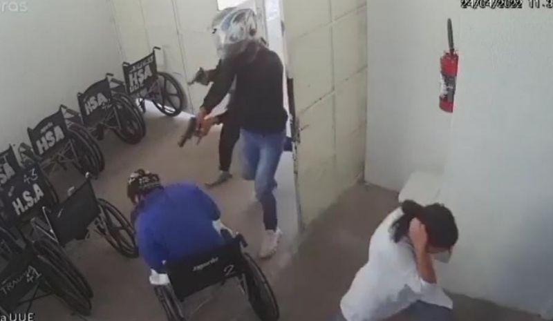 Conforme as imagens, o paciente está numa cadeira de rodas. Dois funcionários chegam a acompanhá-lo, saem do hospital, mas voltam minutos depois. É nesse momento que os criminosos chegam atrás deles e disparam os tiros no homem, que levou disparos na cabeça e abdômen.