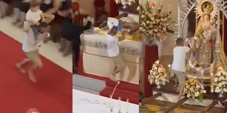 MUNDO – Um homem ainda não identificado deixou uma criança em cima do altar de Nossa Senhora do Carmo. A imagem da invasão à missa foi gravada no último domingo em Tenerife, na Espanha, mas viralizou nesta quarta-feira (2)..