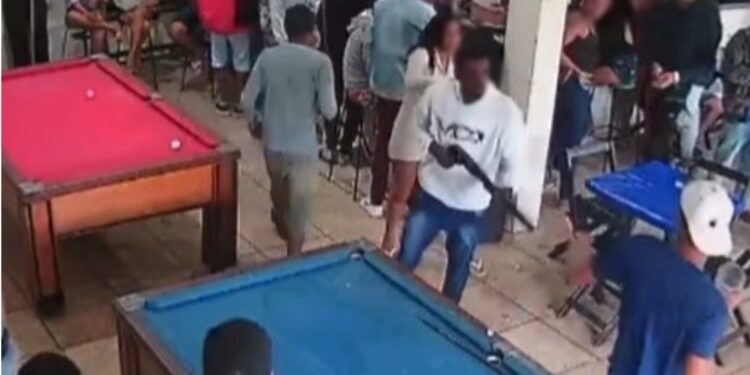 Por volta das 6h, ele entrou no local com uma escopeta calibre 12. Em uma brincadeira, a vítima, bastante alcoolizada, teria passado a mão nas nádegas do