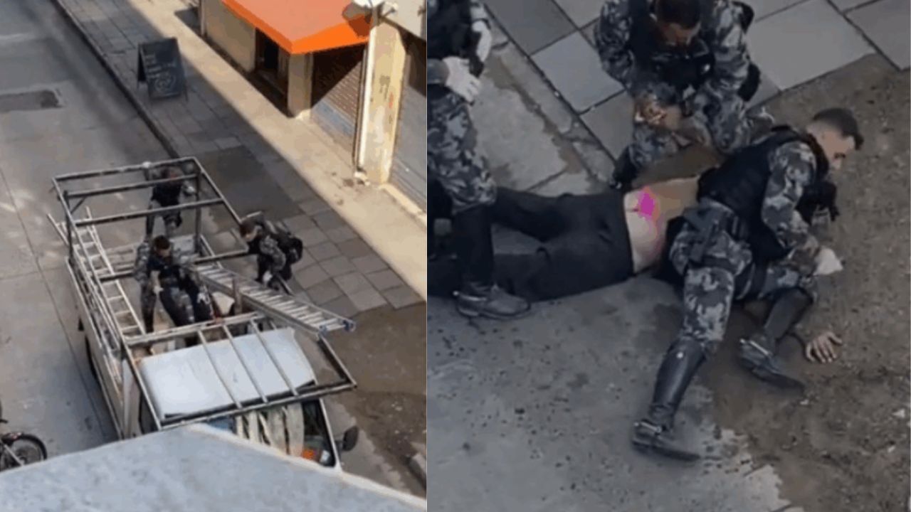 As imagens mostram o momento em que ele resiste à ação policial, se debate e tenta evitar ser colocado na viatura, obrigando os agentes a contê-lo com força.