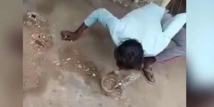 Uma pessoa que assistia a cena acabou registrando o ataque da cobra . No vídeo, é possível ver o homem se abaixando e beijando a boca do animal, que, se sentindo ameaçada e reagindo à ação de Sonu, abocanhou a boca do caçador.