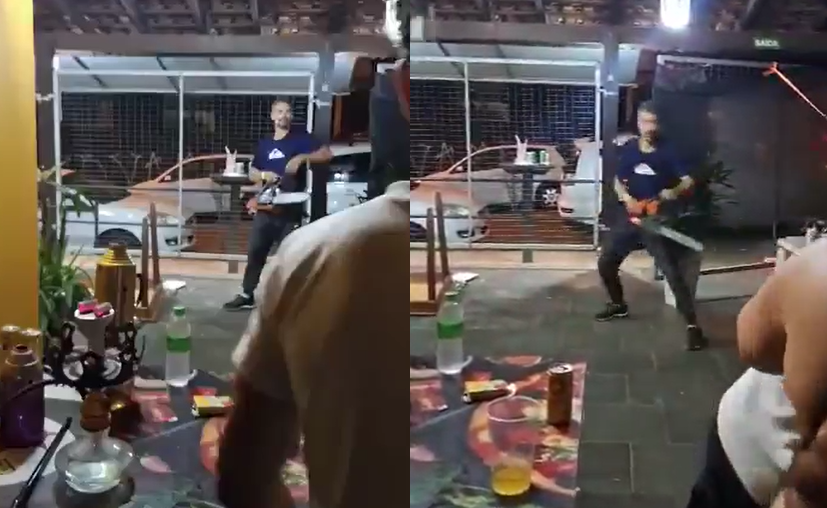 As imagens circuladas nas redes mostram o momento em que o homem avança em direção aos frequentadores com a motosserra em funcionamento. Após intimidar as pessoas presentes, desligou o equipamento e foi agredido por alguns clientes que reagiram à ameaça.