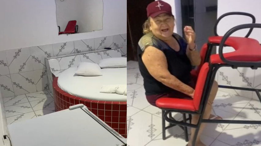 “O dia que eu e minha #mae paramos para dormir no #motel e tinha essa #cadeira kkkkkkk”, diz a legenda do vídeo.