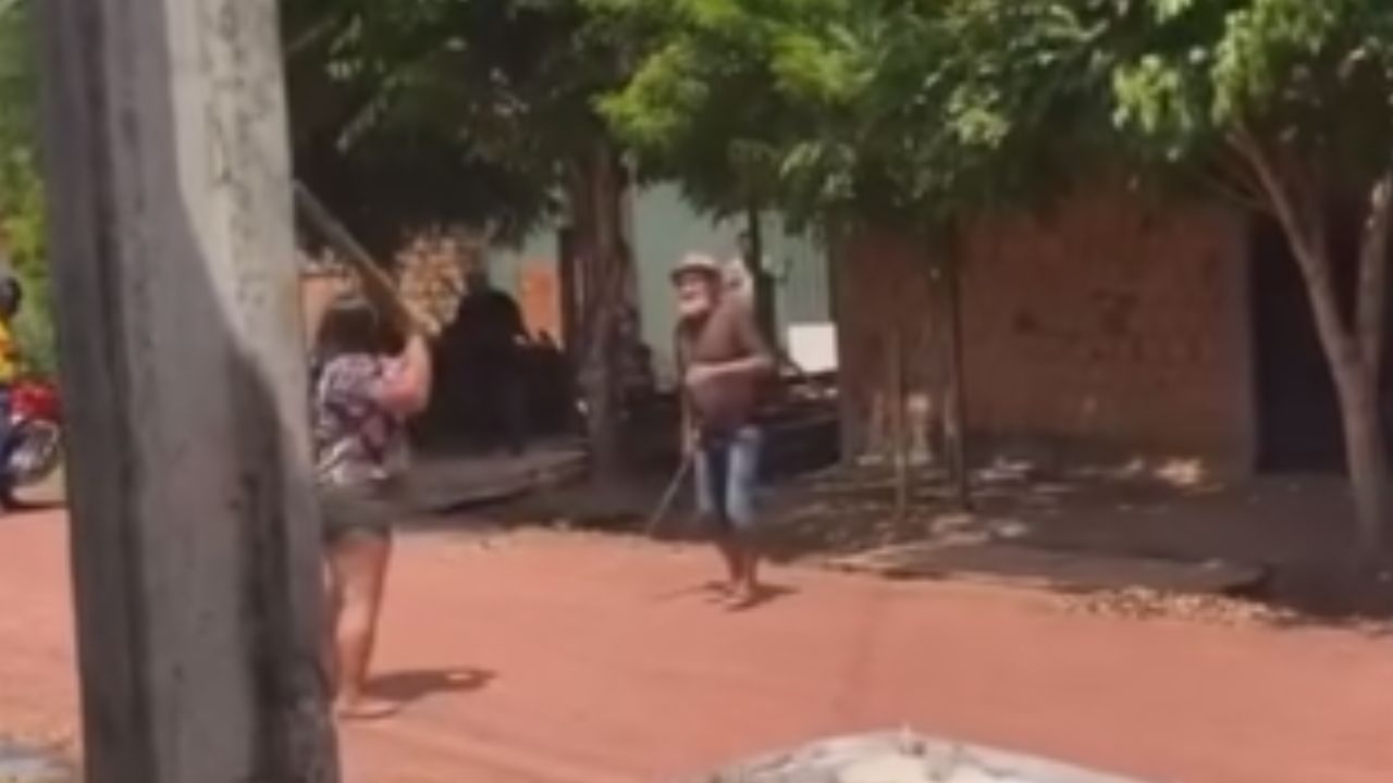 Nas imagens, a mulher surge com um pedaço de madeira para se defender do vovô da barba branca. Ela chega a correr no meio da rua enquanto as pessoas assistem.