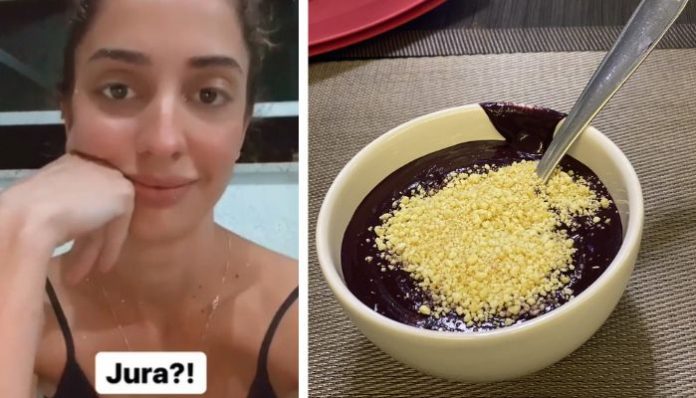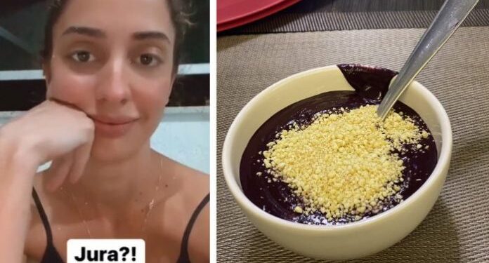 A mineira questiona e debocha da forma de se tomar açaí “Acompanhado de farinha? Mortadela? Açaí é para ser fitness, né?” questiona.