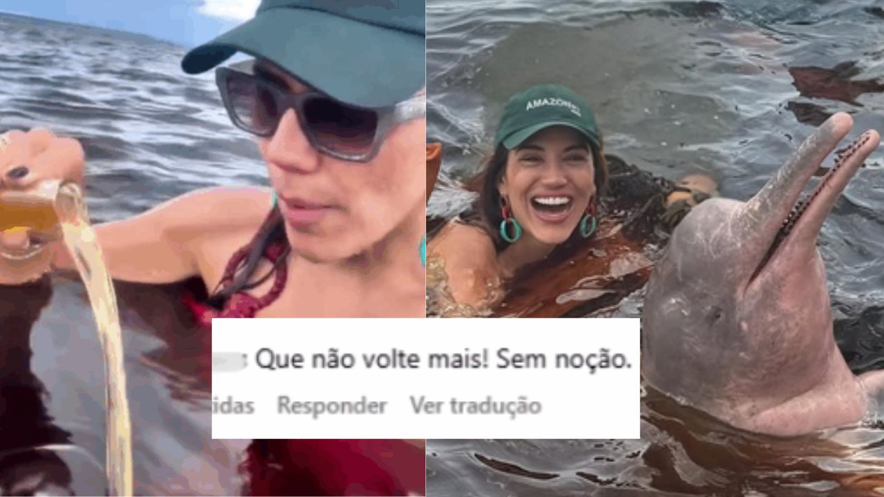Tati Infante, que possui mais de 1 milhão de seguidores no Instagram, fez um passeio turístico para interagir com os botos e se gravou jogando a bebida interagindo com o animal.