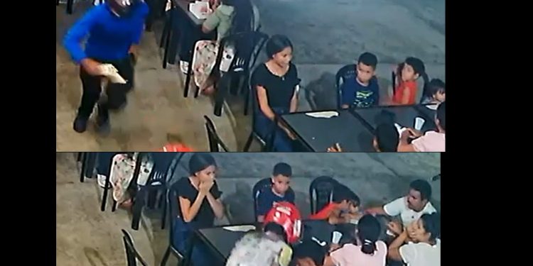 Imagens mostram o momento em que os criminosos chegam na frente da igreja, onde jovens estão sentados à mesa e duas mulheres em pé, na porta da igreja.