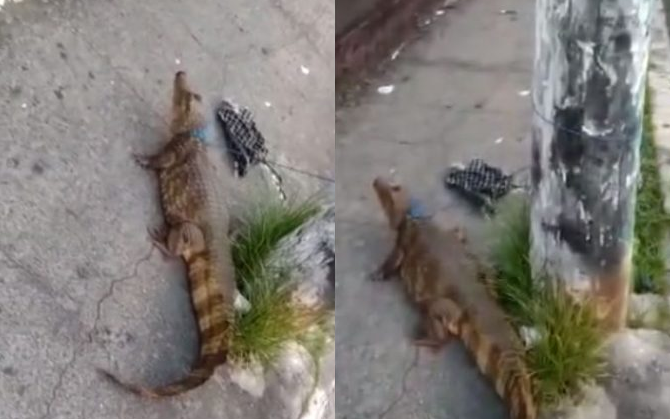 O jacaré, de quase um metro de comprimento, foi amarrado em um poste de energia em frente à Beneficente Portuguesa, na avenida Joaquim Nabuco, Centro, e causou curiosidade das pessoas que passavam pela via, uma das principais da cidade.