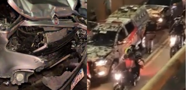 De acordo com a polícia, a viatura estava passando na via quando de repente foi atingida pela picape. Na batida, houve engavetamento e o veículo conduzindo pelo jovem ficou com a frente completamente destruída, causando um prejuízo ao pai dele.