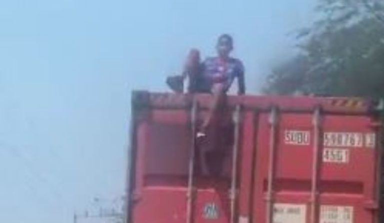 Nas imagens, ele é flagrado em cima de um caminhão que está transportando um contêiner.