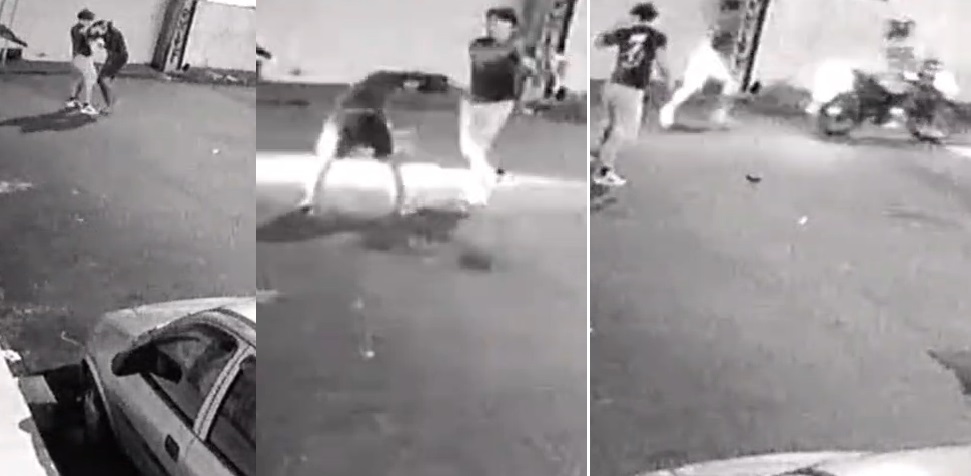 Um entregador de app ajudou o rapaz destemido e os bandidos deram no pé, disparando pela rua de moto antes de apanharem ainda mais.