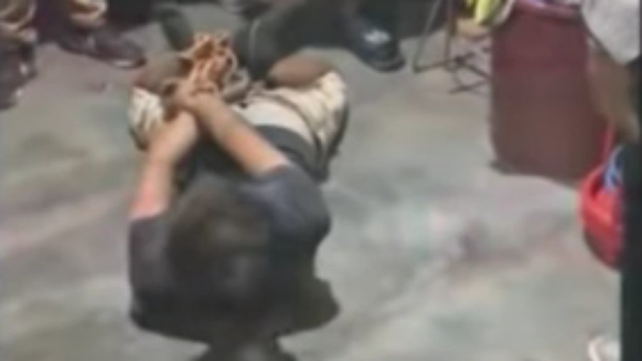 Nas imagens, o garoto aparece no chão, com as mãos e pés amarrados, falando palavras com a voz grave, enquanto é rodeado por várias pessoas que ficam assustadas.