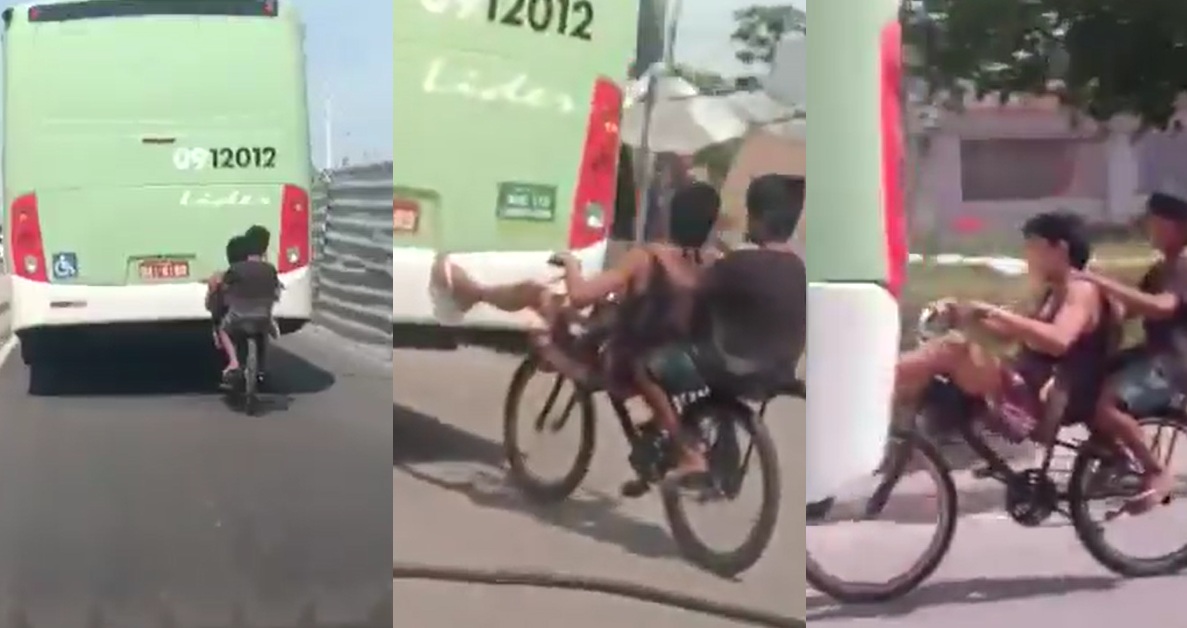 Os dois foram filmados por outro condutor, e não parecem ter a noção do que estão fazendo. As imagens viralizaram nas redes sociais, onde os internautas relatam que esse tipo de audácia é comum na cidade.