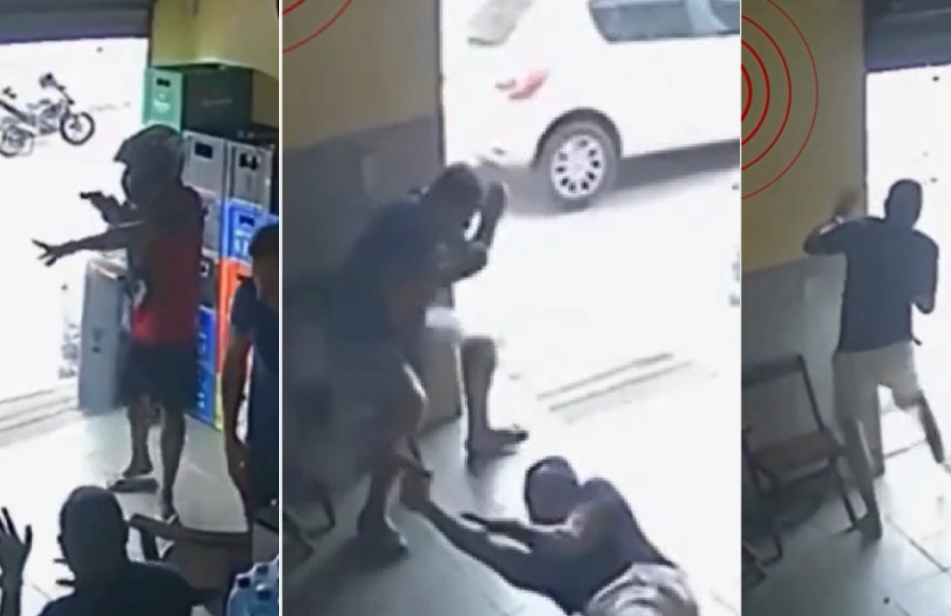 Câmeras de segurança gravaram a reação do policial, que sacou a arma e aproveitou o descuido do bandido para reagir. Nenhum cliente foi alvejado.
