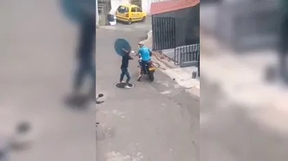Na gravação, feita por uma testemunha, é possível ver o assaltante comentendo o crime enquanto um homem em uma motocicleta o observa. O ladrão carrega a tampa com esforço, mas acaba pisando em falso e cai dentro do esgoto, batendo com a tampa em seu ombro.