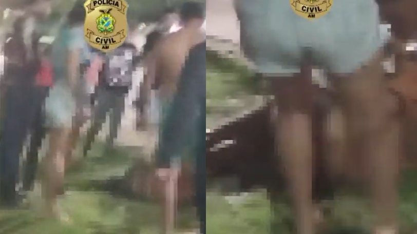 Nas imagens, ele já está imobilizado e várias pessoas ao redor. A mulher é a mais revoltada e dá várias bicudas. O homem também leva chutes, segundo testemunhas.