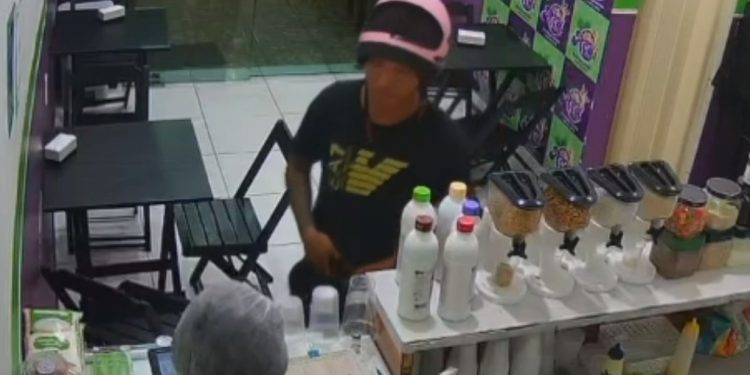 MANAUS – Um bandido ainda não identificado assaltou uma loja que vende açaí, nesta segunda-feira (18), em Manaus. No vídeo registrado pela câmera da loja ele entra discretamente, mostrar a arma e exige a renda do local.