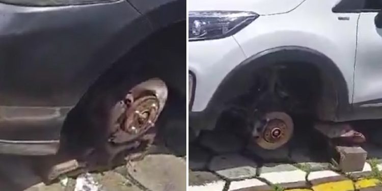 Ela mesma gravou o vídeo e mostrou que outro carro também ficou sem a roda na madrugada deste domingo (23). “Levaram a roda”, constata, sem ter o que fazer.