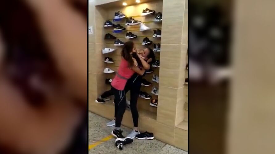 As duas puxam o cabelo uma da outra, dão socos, se batem nas prateleiras e deixam vários sapatos caírem. Os funcionários ficam atônitos.