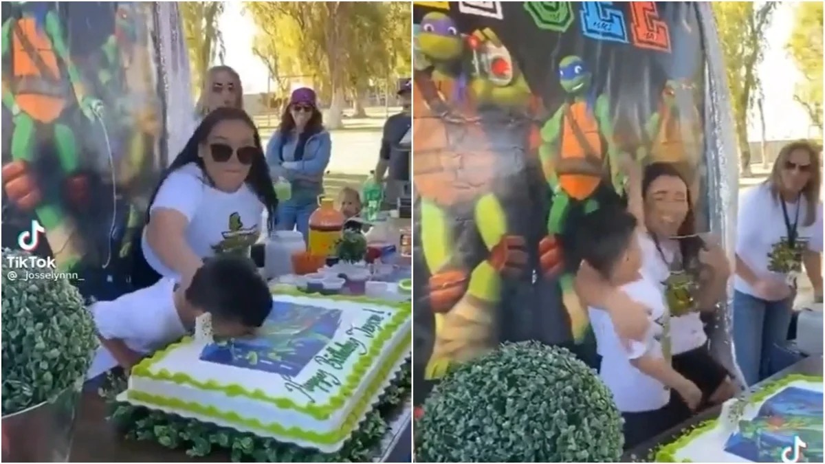 Na tentativa de amenizar a situação, a mulher começa a abraçá-lo, mas ele continua reagindo de forma agressiva, dando tapas em seu rosto. Em seguida, o menino de quatro anos empurra o bolo, que quase cai no chão. Veja o vídeo: