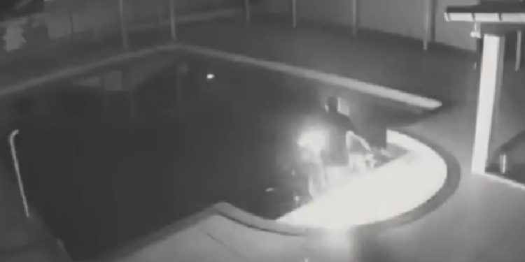 A mãe estava com o filho de 3 anos quando se jogou na piscina. Milagrosamente, ele não se queimou. A PM afirma que o marido jogou gasolina na mulher, e estavavisivlmente bêbado.