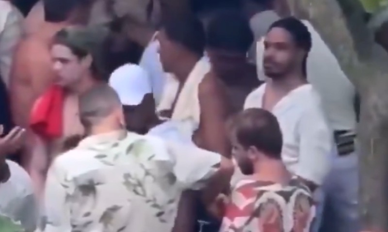 Nas imagens, cerca de 30 homens aparecem juntos e começam a se masturbar e até formar o que parece uma fila. Um deles, no entanto, se abaixa e faz sexo oral no outro. Apesar da situação, as pessoas não se importam.