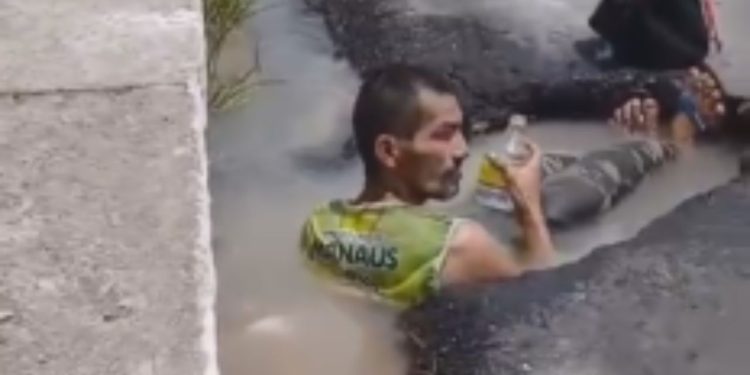 Um vídeo compartilhado em grupos de WhatsApp neste sábado (14), mostra um homem dentro de um buraco com água, no meio do asfalto da avenida Constantino Nery, tomando um corote tranquilamente.
