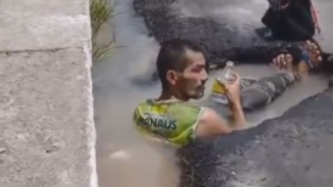 Um vídeo compartilhado em grupos de WhatsApp neste sábado (14), mostra um homem dentro de um buraco com água, no meio do asfalto da avenida Constantino Nery, tomando um corote tranquilamente.