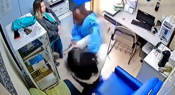O homem deu socos na mulher de blusa branca e acabou levando uma “gravata” para ser contido. Nesta quinta-feira (24), o hospital confirmou que o caso ocorreu no último domingo e que ele segue afastado.