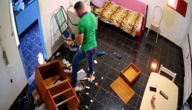 O ´vídeo mostra os prejuízos do surtado, que ainda roubou R$ 300 do patrão da esposa. Quando ele chegou no local, ela e o patrão haviam saído para fazer exames e ver o bebê, suspostamente do casal.