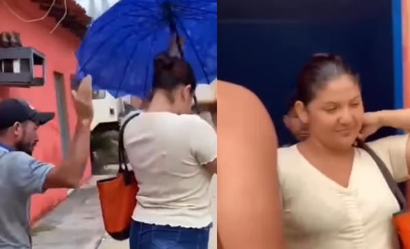 Informado que estava levando a galhada, o homem ainda levou os amigos para conferir se era verdade. Nas imagens primeiro sai o “galã”, depois a “infiel”, de sombrinha, absolutamente plena.