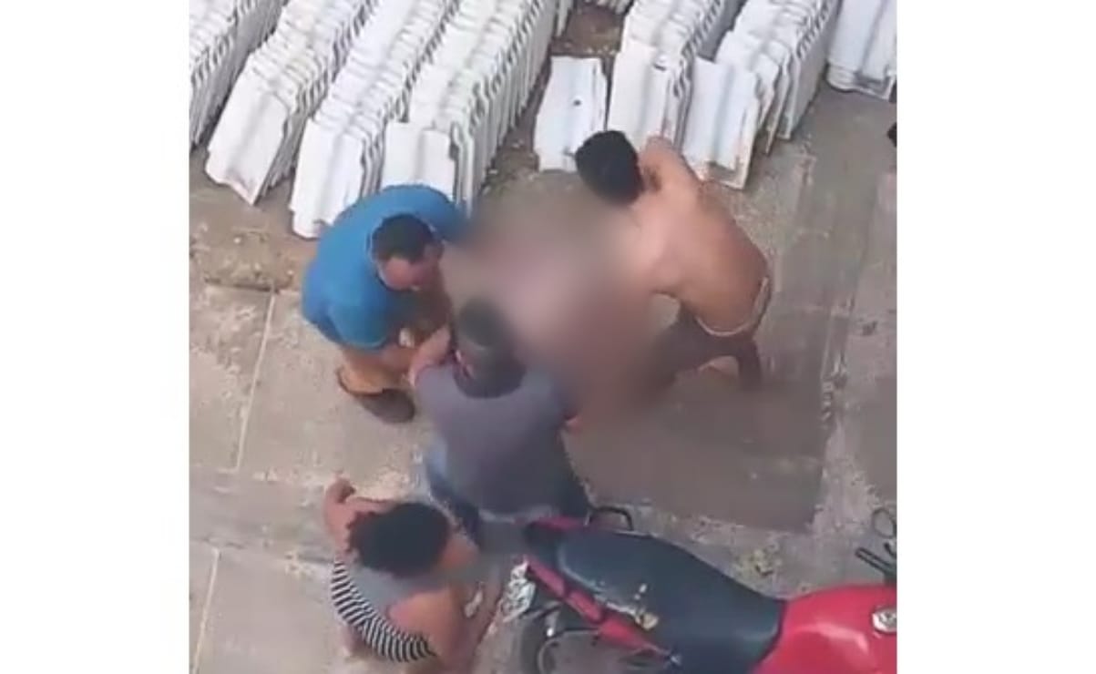 O menino caiu na porta de uma casa e com o forte impacto a cabeça começou a sangrar. Nas imagens ela grita e aparenta desespero segurando um bebê no colo.