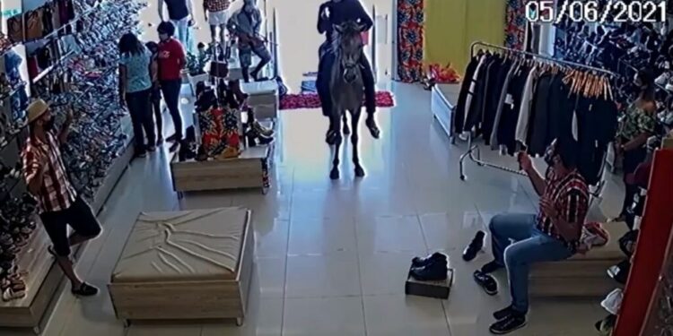 SERGIPE | O Brasil não é para amadores! Dois homens armados invadiram uma loja, na tarde deste sábado (5), na cidade de Itaporanga D’Ajuda (SE) e anunciaram um assalto. Um deles estava montado em um cavalo e colocou o animal dentro do estabelecimento. No local, eles ameaçaram clientes e funcionários.