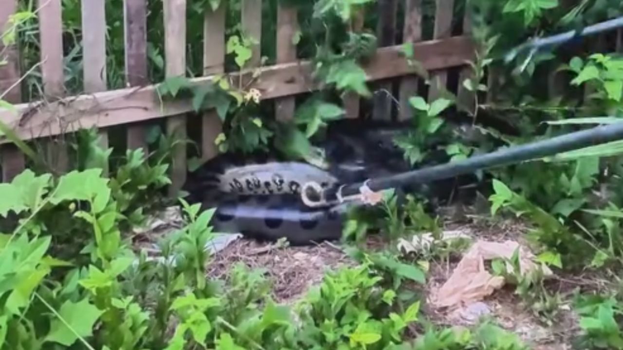 Uma sucuri de aproximadamente 3,5 metros de comprimento estava rastejando pelo quintal do homem.