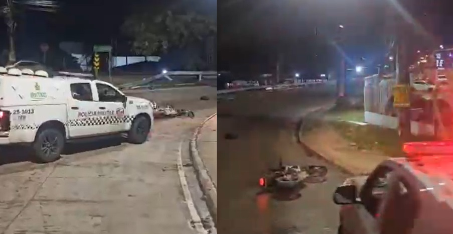 Uma moto usada por dois criminosos ficou caída no asfalto, com um suspeito preso e outro em fuga que ainda não foi localizado. Por muita sorte nenhum PM e nenhuma pessoa foi ferida.