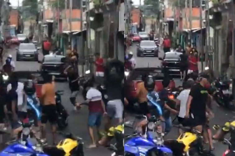 A confusão generalizada onde eles foram flagrados dando “grau” e fazendo muito barulho com as motos aconteceu na conhecida avenida Tefé. De repente, uma correria é registrada e alguns criminosos já chegam com pedaços de pau para cima dos indivíduos.