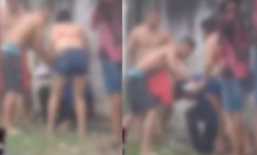 O ladrão foi espancado no meio da rua. Ele leva socos, chutes, e uma mulher também participa da agressão.