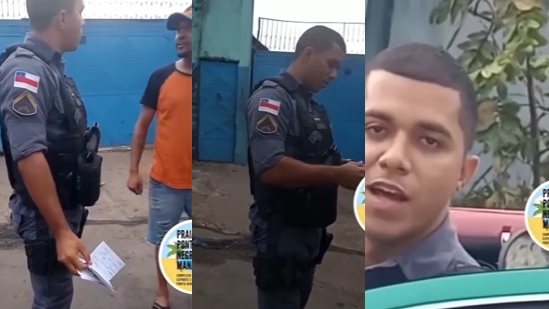 Nas imagens ele diz que a sorte do homem é ele estar com a família. O homem responde que não é vagabundo e o PM pergunta se isso “tá escrito na testa”.