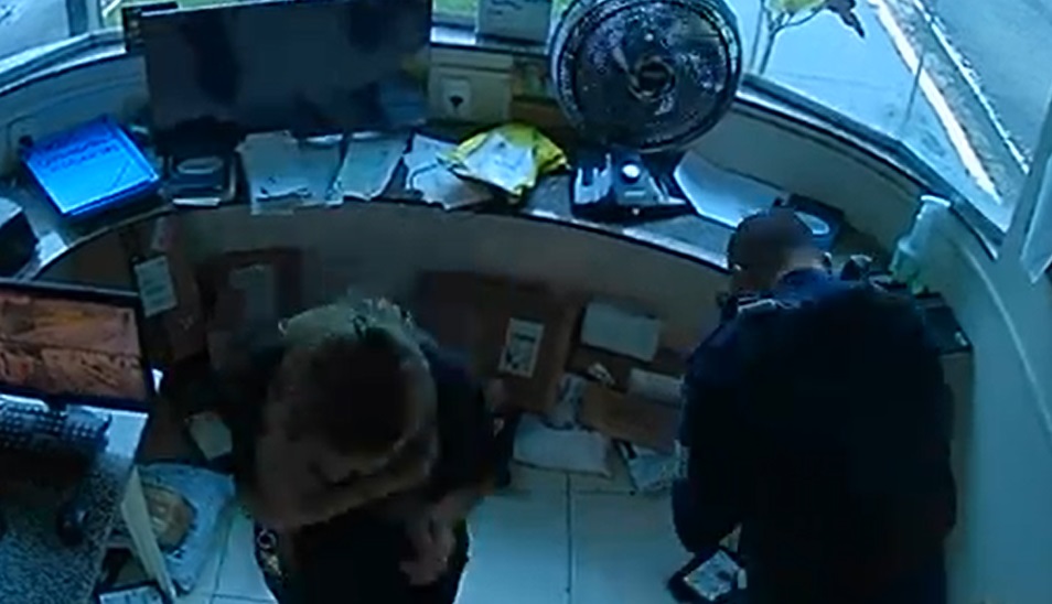 No vídeo é possível ver um segurança e uma segurança na troca de turnos dentro da cabine da portaria, na troca de turno, no momento em que a arma cai e dispara.
