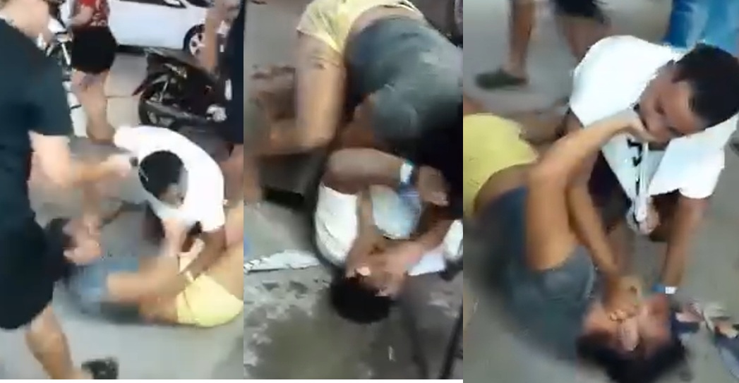 O vídeo mostra os brigões rolando no chão e trocando socos, sopapos e empurrões. Algumas pessoas observam a briga e outras ameaçam intervir.